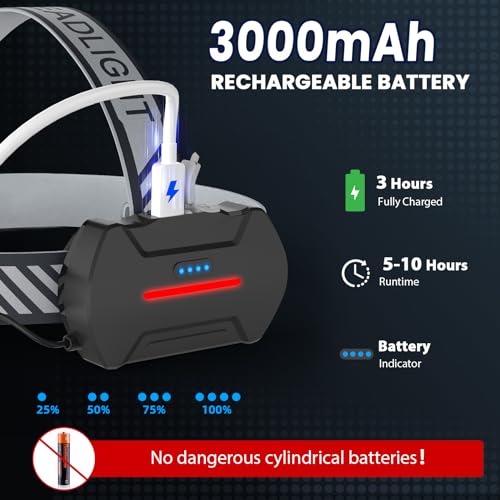 USB Rechargeable and Long Battery Life: Do not use unsafe cylindrical batteries! Our rechargeable headlamp utilize non-removable internal rechargeable batteries to ensure your safety first. You can throw away the AAA batteries. The headlamp rechargeable can boasts an impressive battery life of 4-8 hours of long-lasting power in different lighting modes, so you don’t have to worry about running out of power on your adventures