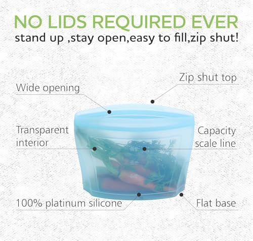 - STURDY AND EASY TO FILL: Not only are these silicone food storage bags very stretchy, the wide base design allows them to stand up and keep the top open for easy and mess-free filling, perfect for storage and meal prep.