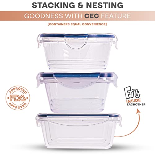 ✅STACK WELL: Kitchen stackable plastic food containers with airtight lids save space in kitchen cabinets for pantry organization. Unique nesting design for tight shelving and top rack placement. Food storage organizer bins fit inside each other. Suitable for fridge or freezer drawers as well.