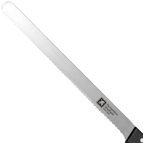The Richardson Sheffield FN213 Universal Professional GENOISE Knife 12″ Exceptionally made, the Universal pattern offers a wide choice of blades, each adapted to its own professional use. Made with MOV steel, a must have range in a professional kitchen. Each of the 14 Universal knives are full tang with 3 stainless steel rivets that guarantee rock-solid sturdiness. From a paring knife to a Chef’s knife and everything in between, Universal has everything you need in one collection. The featured ABS handle is ideal for a knife as the mechanical properties of ABS are resistance and toughness, which is the perfect pairing for everyday working knives; 3 stainless steel rivets are used for stability and endurance and firm grip. The sharp genoise knife measures 12″, features a sharp blade for accuracy and precision. Ideal for slicing, It is used to slice and fill cakes. It can withstand temperatures to 140 degrees F. The cutting edge of the blade fits all professional requirements. Excellent cutting performance and finish. Dishwasher safe, but hand washing is recommended, remove and hand dry your knives at the end of the rinse cycle for longevity.