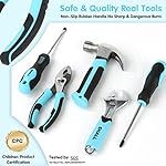 What You Get : This real kids metal tool set makes it fun for kiddie to explore and learn; Slip joint pliers, adjustable wrench, safety scissors, tape measure, safety glasses, screwdriver set, stubby claw hammer, torpedo level, carabiner clip, spring clamp, pick-up tool, carpentry pencils & sharpener, rulers, anti-cutting gloves and tool bag