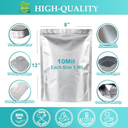 - Thicker Thickness: The thickness is 10 mil, per side is as thick as 5 mil. It has an added internal layer of aluminum foil which provides excellent durability, puncture resistance, and prevents light and air permeation to keep your food safe, ensure that you can store your food for a longer period.