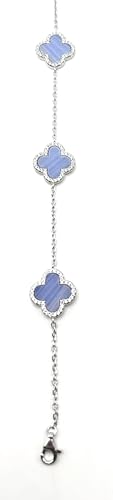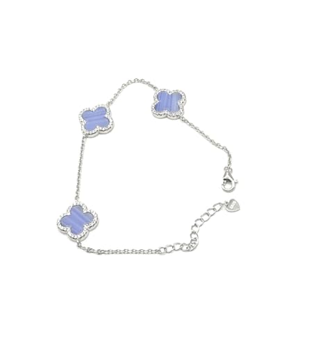Elevate your style with this delicate and charming bracelet. Crafted with meticulous attention to detail, it features three exquisite clovers adorned with shimmering lilac enamel and sparkling clear crystals. These clovers are intricately linked by a sleek silver-toned chain, creating a harmonious and elegant design. This bracelet is the perfect accessory to add a touch of whimsy and sophistication to any outfit. With its adjustable length, it promises a comfortable and secure fit on your wrist. Whether you’re dressing up for a special occasion or simply seeking a touch of elegance for everyday wear, this clover bracelet is sure to captivate and delight.