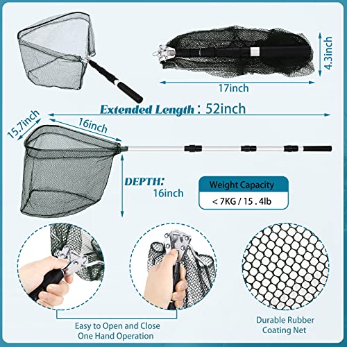Fishing Net and Fishing Hook Remover:Fishing net with handle is foldable and retractable extends from 16.5″ to 52″, total handle with hoop expend to 52 inches, Stainless steel fishing tongs: corrosion resistance, good toughness and high hardness. Open loop, unhooking, thread trimming, bait adjustment multi-functional pliers