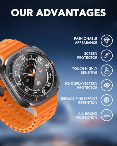 • High definition: Galaxy watch Ultra 7 47mm screen protector made from tempered glass material, features high transparency and ultra-low reflection, 99% light transmittance, reveal true color of galaxy watch Ultra, the temper glass film features high transparency and ultra-low reflection.Anti-explosion and Scratch proof: The Galaxy watch Ultra 7 47mm accessories protect your Galaxy watch Ultra 7 47mm against accidental drop, scratches, dirt and dust during all activities.