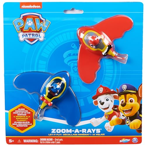 The Paw Patrol Zoom-A-Rays swimming pool toys from SwimWays is a kid-powered underwater glider with amazing hydrodynamic action! This Paw Patrol toy brings your favorite pups to the pool, lake or beach for a day of fun and water exploration! No batteries are required to play, simply submerge under water, and let them glide! Your little ones will love watching Chase and Marshall as they drift through the water and swirl to the surface, with the hydrodynamic action propelling them at high speeds! These kids pool toys and pool diving toys are great summer toys to have for swimming pool games with friends and family, they can be taken to the beach or used as lake toys as well, and young swimmers will be encouraged to hone their skills when playing with the Paw Patrol Zoom-A-Rays. These preschool toys are also great for pool party games and are great Paw Patrol toys for boys and girls for summer pool parties! Recommended for children aged 5 or older.
