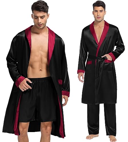 SWOMOG Men’s 3 Pcs Robe Silk Satin Kimono Bathrobe with Shorts&Pants Set Lightweight Soft Sleepwear