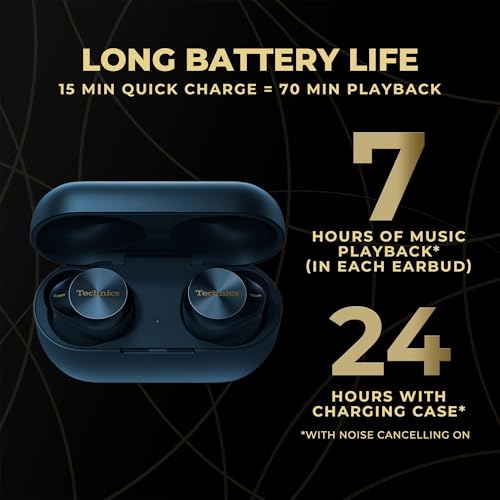 Stay on top of your game with impressively powerful, noise cancelling AZ80 wireless ear buds with reference-quality sound. Discover legendary recorded music as you’ve never heard it before with Technics’ highest-resolution audio, giving you the feel of the arena, an exclusive club, or in-studio magic; hear all the incredible details, from the warm timbre of a singer’s voice to the thrill of the beat drop. Like you, these bluetooth earphones work as hard as they play, with state-of-the-art noise cancellation so you can focus on your critical business. A must-have for high-priority business calls, AZ80 buds ensure you voice comes through seamlessly on every call, with enhanced JustMyVoice technology using 8 MEMS microphones and an advanced noise-reducing algorithm to minimize outside interference. Now you can connect to more than two devices at the same time – Technics’ Multipoint technology allows you to connect to three Bluetooth devices simultaneously, keeping you connected to your computer, tablet and phone at once and giving you the ability to multitask with flow, whether you’re on a plane or on the golf green. Charge wirelessly (Qi compatible) to keep your workspace and bedside table neat; supports wireless hi-res audio using state-of-the-art Bluetooth with LDAC compatibility. Noise cancellation, EQ, and more are customizable through the Technics audio app so you can always have sound just as you want it.