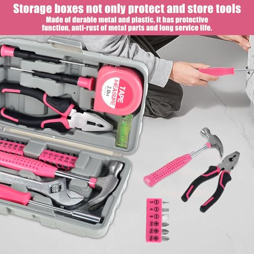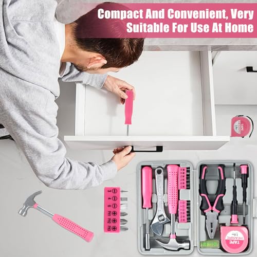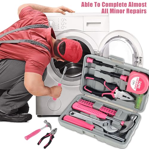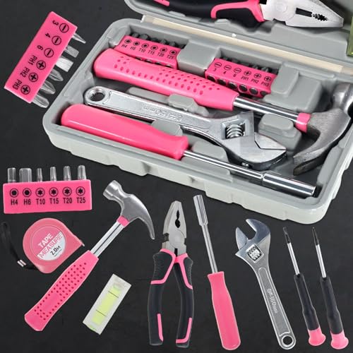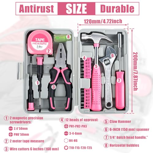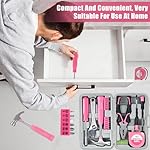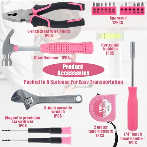 🧰Compact and Lightweight: This household tool set features pink trim and a compact and lightweight design, suitable for use around the house. It comes with a carrying case that measures only 7.87×4.72×1.97 inches. Assortment of necessary tools are in one tool chest, durable plastic case with internal molded compartments to keep each component protected and easily accessible