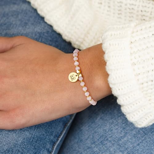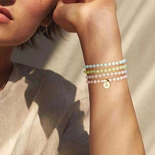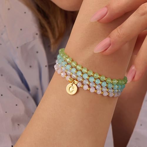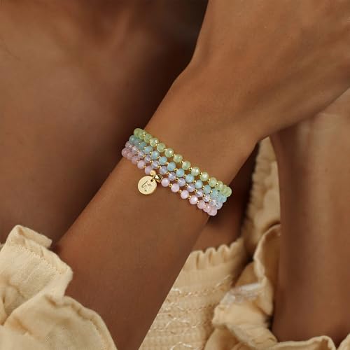 Ursteel 4 Pcs Initial Bracelets Set for Women – Beaded Crystal Bracelets for Women Bridesmaid Gifts, Gold Disc Link Charm Letter Bracelets for Women Jewelry, Surfer Stackable Stretch Bracelet