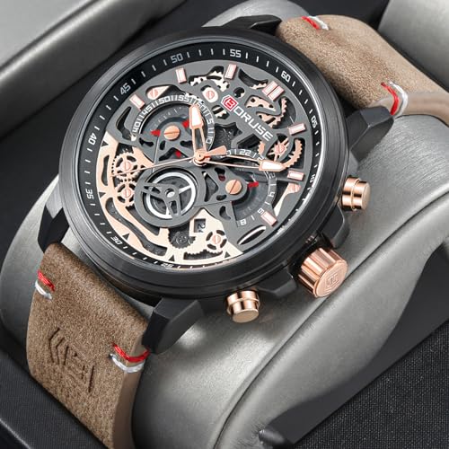 Watches for Men Business Chronograph Big Face Skeleton Quartz Watch Dress Classic Luminous Analog Calendar Waterproof Wristwatch for Leather Strap
