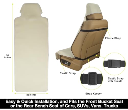 UNIVERSAL FIT & EASY TO INSTALL: Our seat cover fits the front bucket seat or the rear bench seat of Cars, SUVs, Vans, Trucks. It measures 58 inches long, and 22 inches wide, with 1/8 inches thickness. Slip on the cover in SECONDS to offer easy and effective protection of your valuable car seat, and enjoy the driving with peaceful mind!