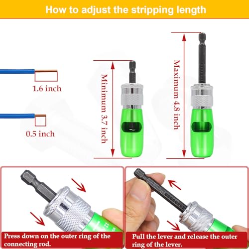 [Wire Stripper Tool Set]Wire stripper for drill set included 5x wire strippers, 1x replacement blade, 1x wire stripper connecting rod, 1x L-shaped wrench, 1x P1, P2, P3, P4, P6 size of wire caps,2x Wire Nut Twister.