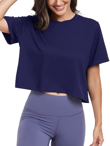 KevaMolly Workout Crop Tops for Women Loose Fit UPF50+ Breathable Yoga T Shirts Running Athletic Cropped Workout Tops $14.99