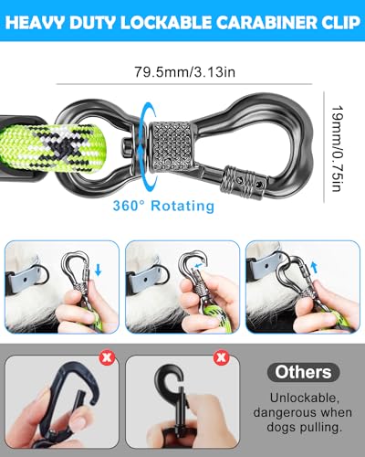 360° Tangle Free: Xiaz double handle dog leash is equipped with rustproof swivel clasp, 360° rotating, without worrying about the leash getting tangled and twisted when the dog is pulling. Allows you to effortlessly and confidently secure your dog to a pole, gate, or tree, and the lockable hook is design to prevent your dog from accidentally escaping or getting into an altercation.