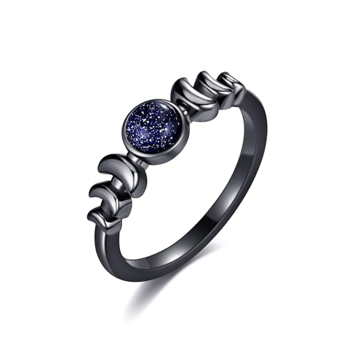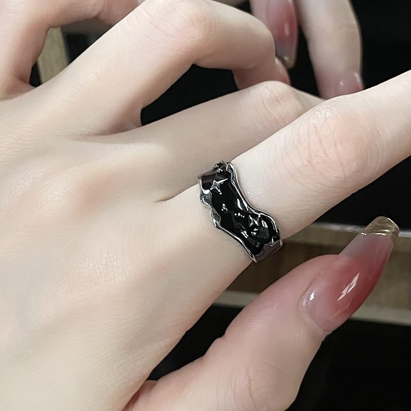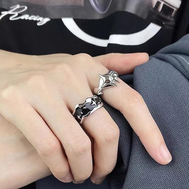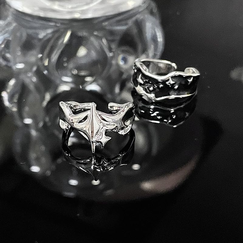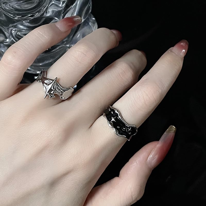 Y2k Rings for Women Black Silver Star Statement Rings Punk Grunge Goth Chunky Rings Adjustable Open Ring Set