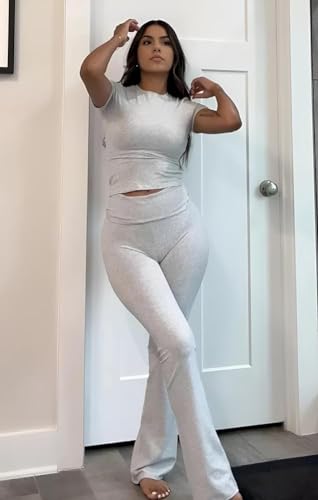 ZFLM Casual Workout Two Piece Outfits for Women Short Sleeve Crop High Waist Foldover Flare Pants Tracksuit Sets Streetwear